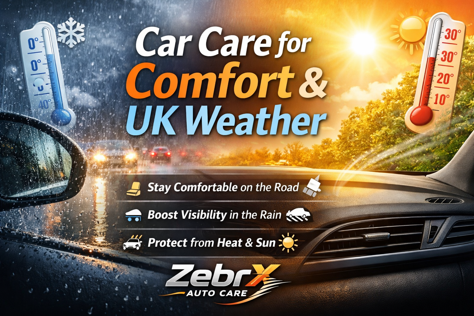 By ZebrX Auto Care – Built for UK Roads, Designed for Driver Comfort The UK’s weather can change in minutes – sunshine in the morning, rain by lunchtime, and chilly winds by evening. These rapid shifts don’t just affect your drive; they impact your comfort, visibility, and your vehicle’s long-term health....